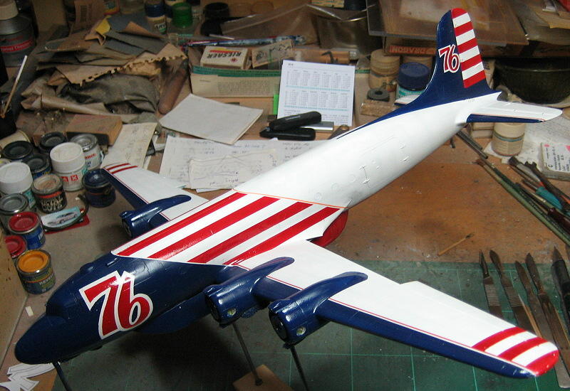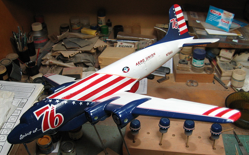 Gespritzt wurde mit Gunze H1 und H24, sowie Humbrol 19 und Revell 53. Lediglich die Schriftzüge und die Sterne entstanden als Decal (nochmal herzlichen Dank an db-flight für seine Hilfe). |